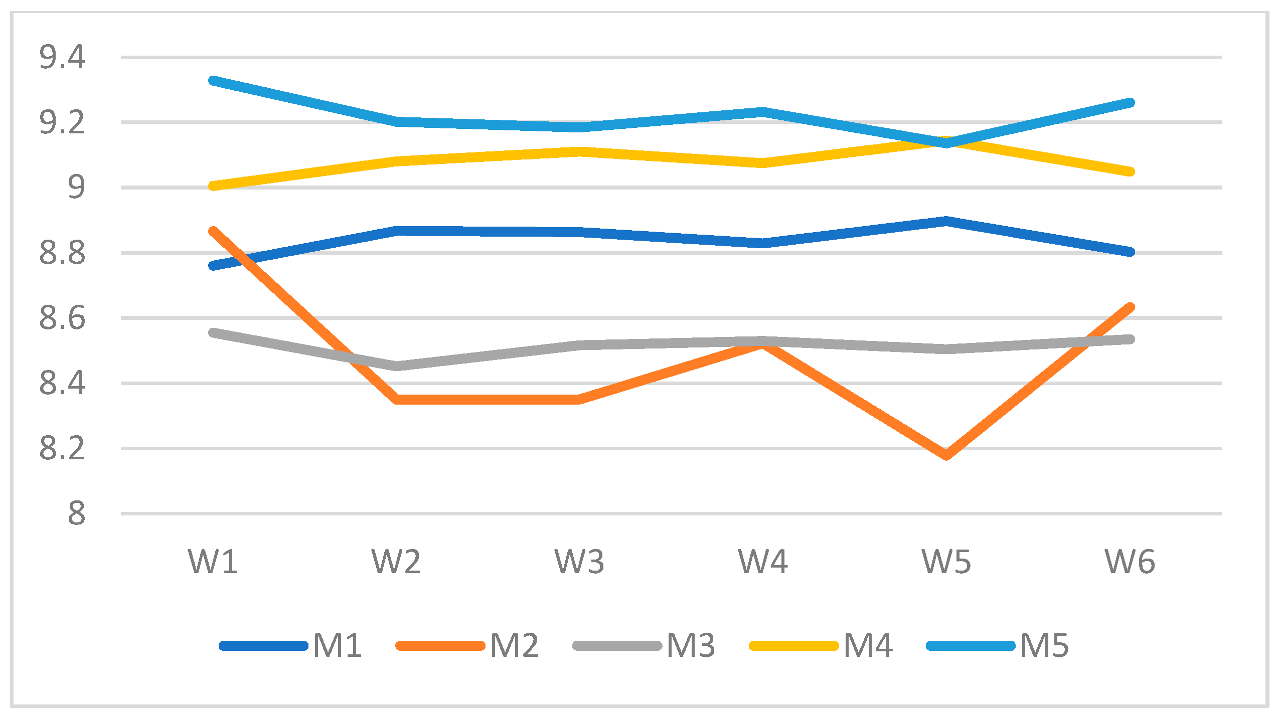 The score ranged from 0 to 10, with higher values indicating better performances. Detection delay (DD) was normalized by a factor of 13, which corresponded to the maximum delay observed in our experiments. However, as stated earlier, the maximum acceptable detection delay for this system was 7.41 s. Any detection with a delay exceeding 7.41 s was considered suboptimal, leading to a significantly lower score. While delays above this threshold were still recorded for analysis, they indicated a failure in meeting the near-real-time requirements and negatively impacted the model’s overall evaluation. To ensure that no seizure went undetected, minimizing false negatives (FN) was critical. This was achieved by maximizing sensitivity (recall), which directly impacted the model’s reliability. The overall score was computed by weighting three key components: detection delay, accuracy, and false negatives using the parameters alpha (α), beta (β), and gamma (γ), based on the project’s objectives. To analyze the behavior of the proposed composite score under different performance trade-offs, five representative model configurations (M1–M5) were selected, shown in