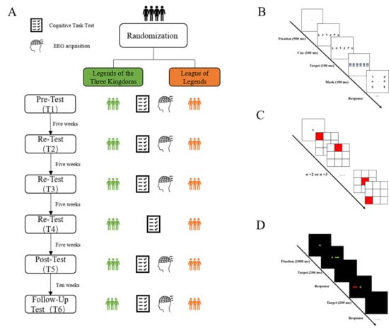 A substantial body of research, including both cross-sectional and training intervention studies, has demonstrated that video games can enhance various cognitive functions, such as visual attention, executive control, visual short-term memory, and processing speed. For example, Dobrowolski et al. compared participants playing first-person shooter and real-time strategy games, suggesting that the cognitive benefits of video gaming may vary by genre [31]. However, a critical gap remains: no longitudinal intervention studies have directly compared different types of video game training in terms of their effects on cognitive function and associated changes in brain structure and function. Specifically, there is limited evidence regarding whether different game genres exert distinct, type-dependent effects on cognition and neural activity. To address this gap, the present study conducted a 30-week longitudinal gaming experiment, collecting behavioral and resting-state EEG data at multiple time points for feature analysis and evaluation. This study systematically compared the effects of two types of game training—action video games and strategy card games—on spatial attention, spatial working memory, executive function, and EEG measures. We adopted three classic, domain-specific psychological paradigms (Distributed Spatial Attention task, Spatial N-back task, and Color-Direction Conflict task) to operationalize and measure the three focal cognitive domains. Each paradigm, through its structured design and objective performance indicators, directly indexes a distinct core cognitive domain, as corroborated by extensive cognitive psychology and neuroscience. The Distributed Spatial Attention paradigm was adapted from the spatial vigilance and multi-location monitoring protocols pioneered by Posner [32,33], who first demonstrated that spatial attention can be selectively oriented and distributed across non-contiguous regions independent of eye movements. The N-back paradigm is the gold-standard assay for visuospatial working memory [34], as defined by Jonides et al.’s seminal working memory model [35], which outlines the core functions of temporary information maintenance and online manipulation. The Color-Direction Conflict paradigm is a variant of the classic Stroop paradigm [36]. This paradigm measures executive function by requiring participants to respond to one stimulus attribute while inhibiting prepotent responses to a conflicting attribute [37]. We hypothesized that both games improve cognitive performance and induce changes in EEG features, with action game training producing greater cognitive gains and neural modulation due to its higher cognitive demands.