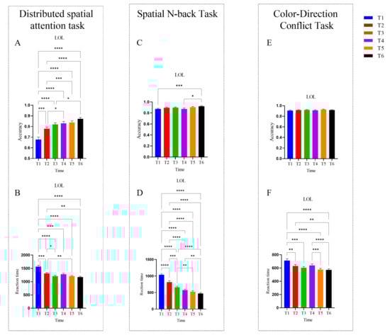 Intra-group behavioral results for the LOL group. (A) Accuracy in the Distributed Spatial Attention task. (B) Reaction time in the Distributed Spatial Attention task. (C) Accuracy in the Spatial N-back task. (D) Reaction time in the Spatial N-back task. (E) Accuracy in the Color-Direction Conflict task. (F) Reaction time in the Color-Direction Conflict task. Error bars represent the standard error of the mean. * p < 0.05, ** p < 0.01, *** p < 0.001, **** p < 0.0001.