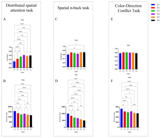 Intra-group behavioral results data for the TKK group. (A) Accuracy in the Distributed Spatial Attention task. (B) Reaction time in the Distributed Spatial Attention task. (C) Accuracy in the Spatial N-back task. (D) Reaction time in the Spatial N-back task. (E) Accuracy in the Color-Direction Conflict task. (F) Reaction time in the Color-Direction Conflict task. Error bars represent the standard error of the mean. * p < 0.05, ** p < 0.01, *** p < 0.001, **** p < 0.0001.