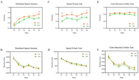 Inter-group behavioral results between the LOL and TKK groups. (A) Accuracy in the Distributed Spatial Attention task. (B) Reaction time in the Distributed Spatial Attention task. (C) Accuracy in the Spatial N-back task. (D) Reaction time in the Spatial N-back task. (E) Accuracy in the Color-Direction Conflict task. (F) Reaction time in the Color-Direction Conflict task. Error bars represent the standard error of the mean. * p < 0.05, ** p < 0.01.