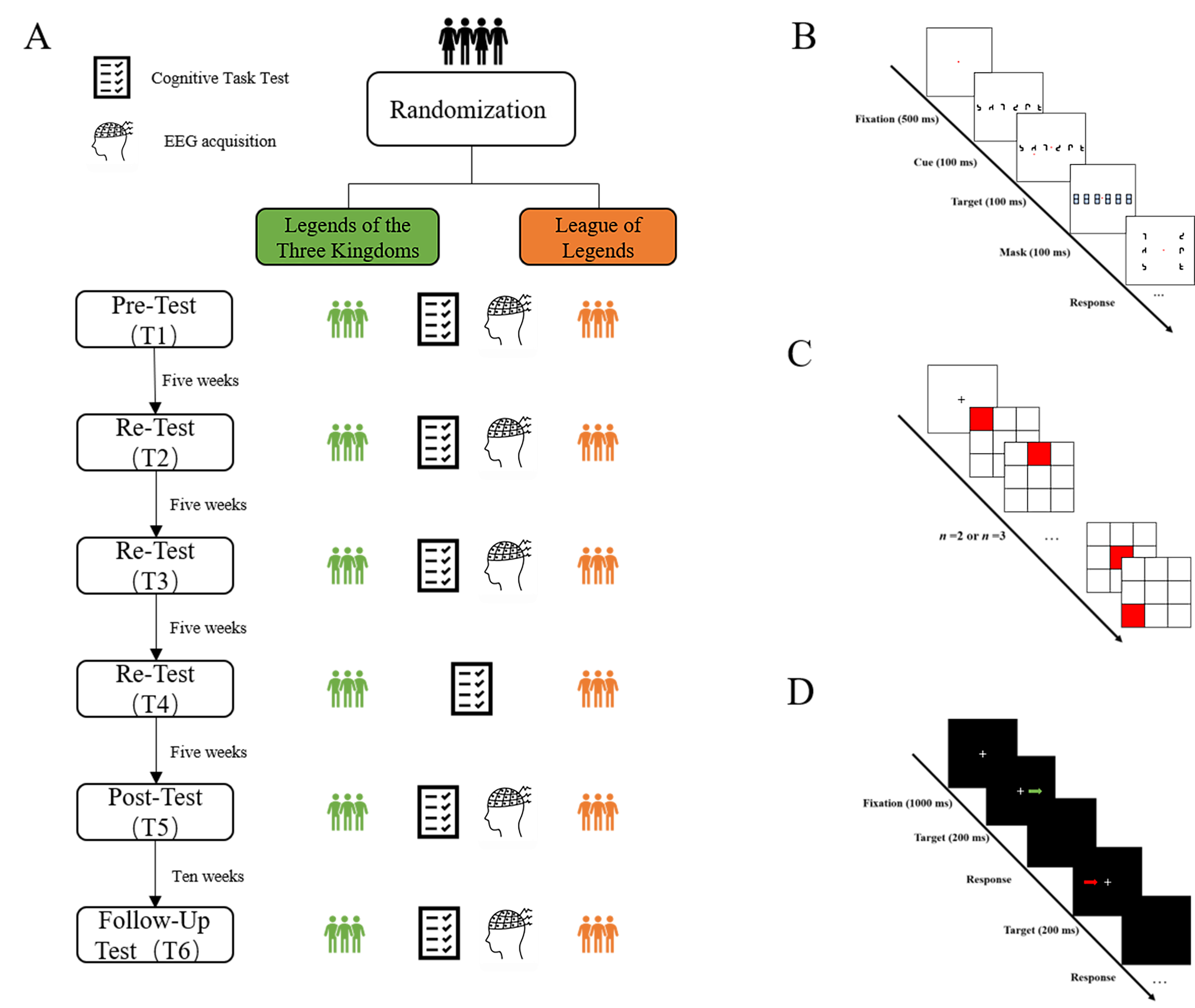 43]. While repeated cognitive testing (administered once every five weeks) may have introduced mild practice effects that contributed to baseline-to-post-test performance increments, two design features mitigated this confounding factor: (1) The 5-week assessment interval was long enough to attenuate cumulative skill gains from test exposure, and (2) the randomized administration order of cognitive tasks prevented the formation of fixed response habits. Most critically, practice effects were uniformly distributed across all experimental groups, as all participants completed identical assessment procedures. Thus, the observed inter-group differences in behavioral performance improvements can still be confidently attributed to the differential impacts of the two game training protocols, rather than uneven practice effects across groups.