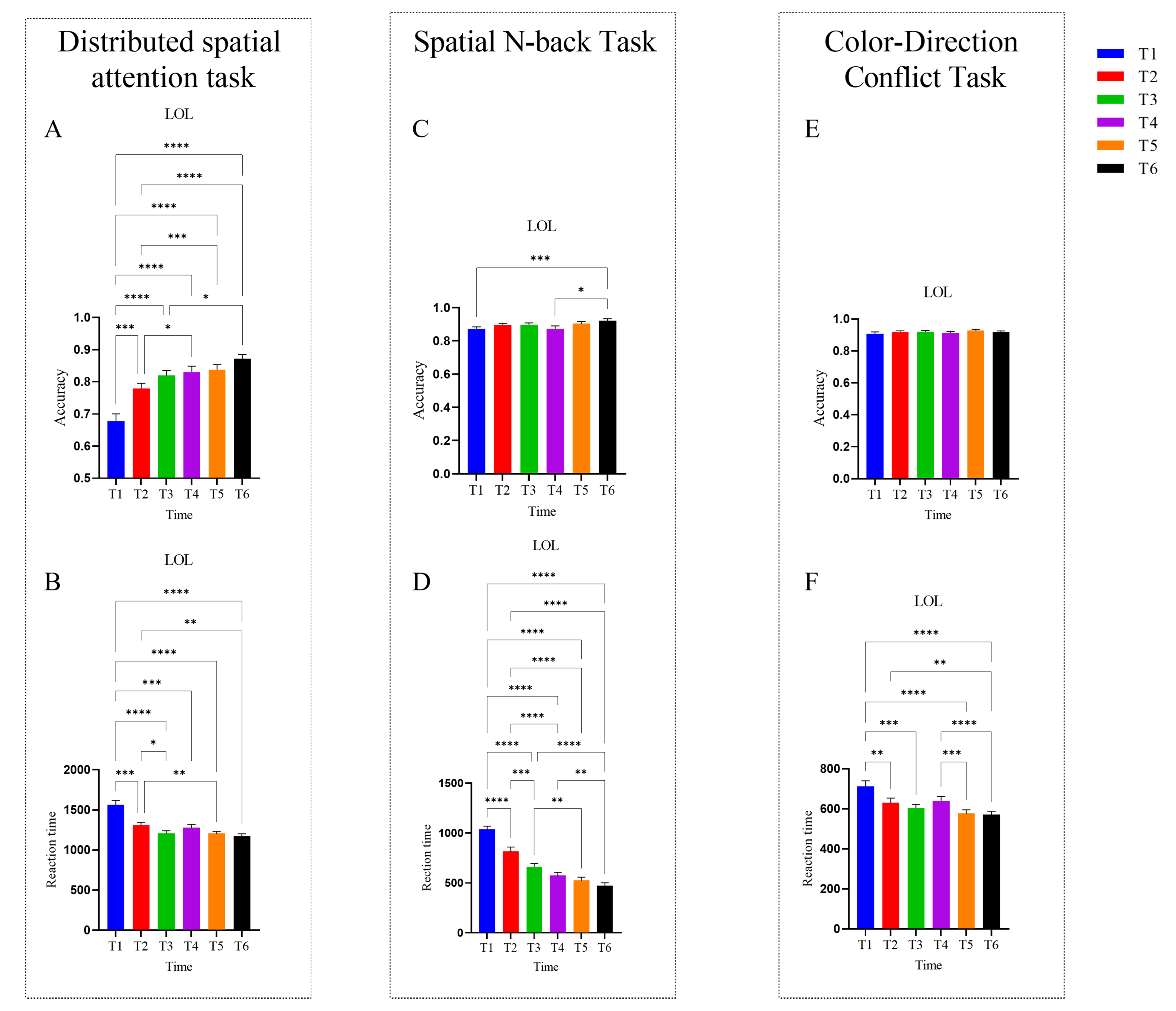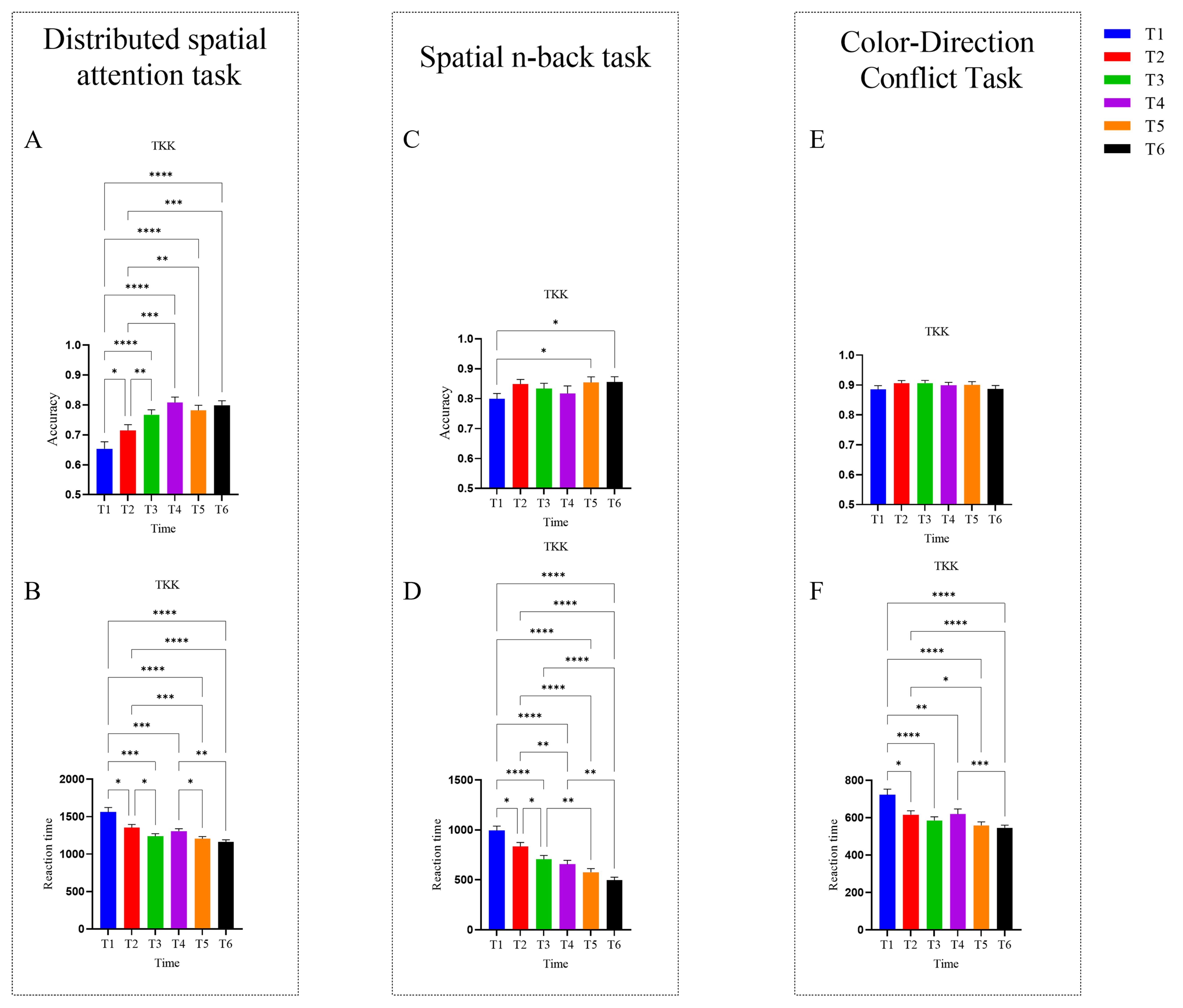 partial η2 = 0.383) exhibited a significant main effect of time, indicating substantial improvements in distributed spatial attention over the course of training. Tukey’s post hoc test results revealed significant accuracy improvements for the comparisons T1 vs. T2–T6, and T2 vs. T3–T6 (