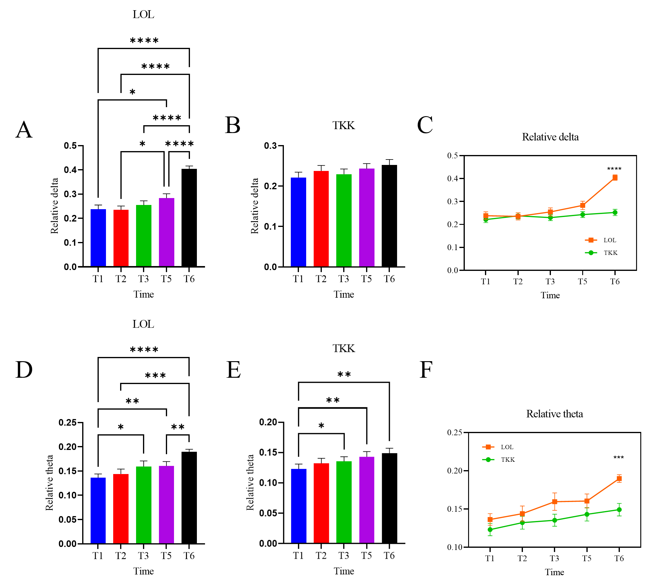 partial η2 = 0.227). Post hoc Bonferroni-corrected multiple comparisons revealed that the LOL group had significantly higher relative delta than the TKK group at T6 (