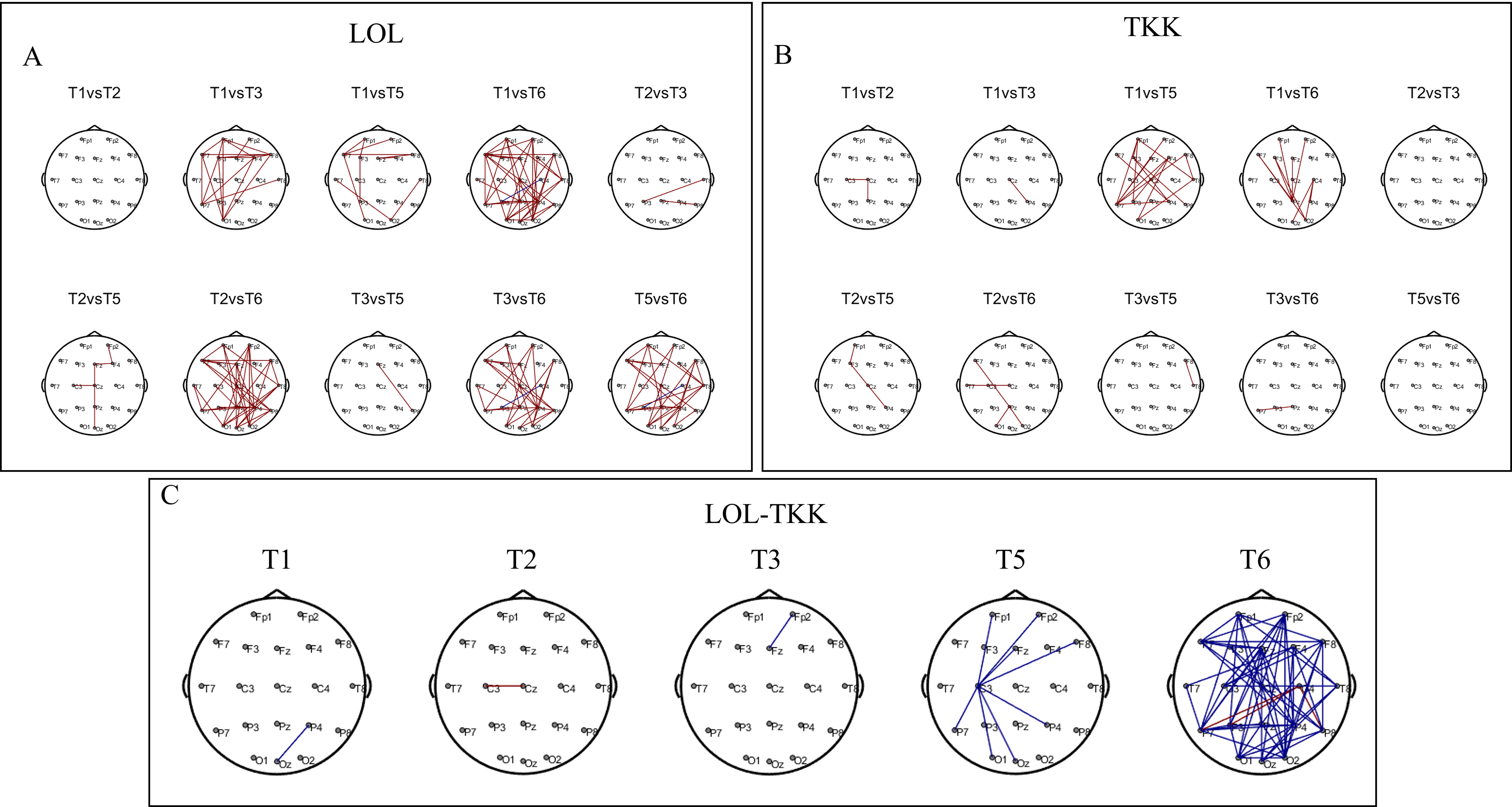 Figure 6B). Inter-group comparisons showed that at T5 and T6, alpha-band network connectivity in the LOL group was significantly lower than that in the TKK group (