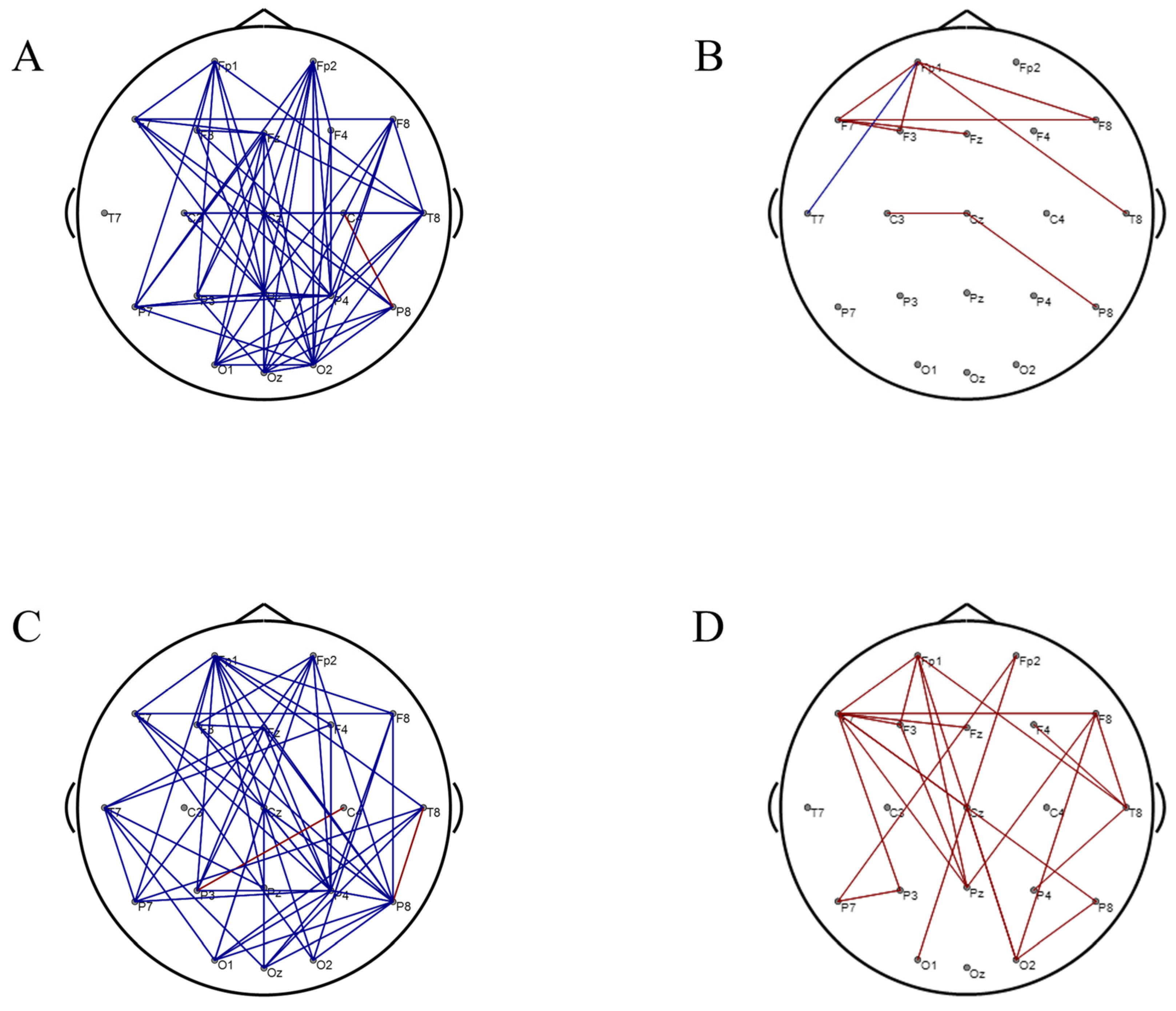 Figure 7B,D). However, alpha band brain network connectivity was not significantly correlated with the accuracy and reaction time of the Color-Direction Conflict task.