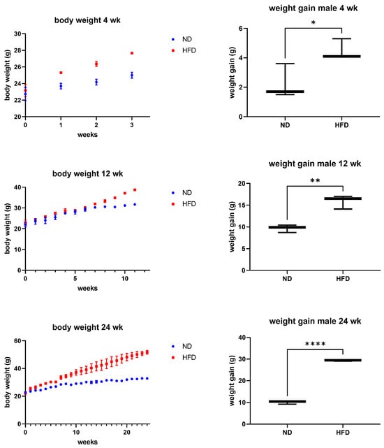 Male mice fed an HFD displayed a clear and consistent increase in both body weight and weight gain compared to ND-fed controls across all feeding periods (4, 12, and 24 weeks) (Figure 1). The effect was already apparent after four weeks and persisted throughout the experiment, confirming that the diet reliably induced an obese phenotype.
