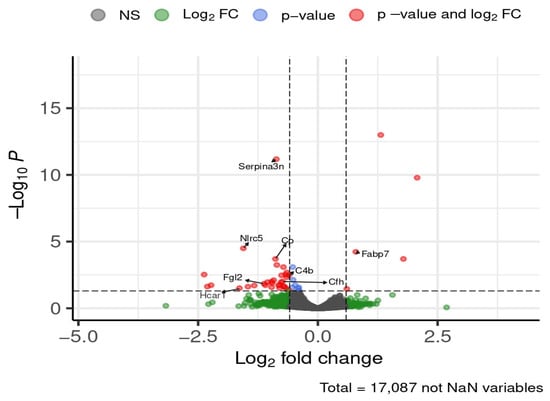 Serpina3n, NLR family, CARD domain containing 5 (Nlrc5), ceruloplasmin (Cp), complement C4B (C4b), complement component factor H (Cfh), fibrinogen-like protein 2 (Fgl2), and hydroxycarboxylic acid receptor 1 (Hcar1) were upregulated in HFD-fed mice, showing 1.5- to 3-fold increases. Fatty acid binding protein 7 (Fabp7) was downregulated by approximately 1.7-fold. STRING analysis indicated that Cp, Serpina3n, C4b, and Cfh formed a connected network (Figure 9).