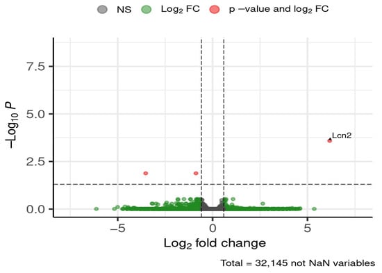 LCN2 has been described as an adipokine involved in glucose and lipid homeostasis, and as an acute phase mediator in the CNS [41,42]. Prior studies have reported opposing effects of LCN2. For example, LCN2-deficient mice are cold-sensitive and develop significantly increased body fat mass as well as exacerbated dyslipidemia, fatty liver, and insulin resistance when fed HFD compared to wild-type (WT) mice [42]. LCN2 can exert anti-inflammatory effects after LPS stimulation, possibly by controlling the activation of the NF-κB-STAT3 loop and thus limiting the inflammatory response [41,43]. In contrast, other studies describe LCN2 as pro-inflammatory, showing that its expression is induced after injury and promotes hippocampal microglial activation and conversion to M1 phenotype [44,45]. LCN2 plays an important role in HFD-induced adipose tissue remodeling as well as in inflammation, especially in the brain. In our dataset, Lcn2 was strongly downregulated under HFD compared to ND, suggesting that its potential regulatory, anti-inflammatory functions [41,43] may have been diminished in this context. By contrast, the pronounced pro-inflammatory effects observed in stroke or acute injury [44,45] were not reproduced by dietary stress alone.