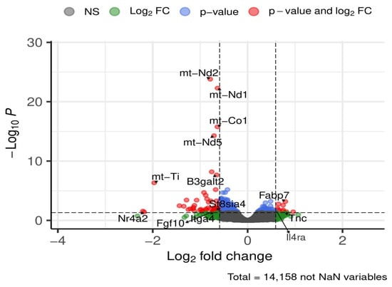 Additionally, several significantly regulated mitochondrial genes (mt-Nd1, mt-Nd2, mt-Nd5, mt-Co1, mt-Ti) were upregulated, showing increases from ~1.5-fold to ~4-fold.