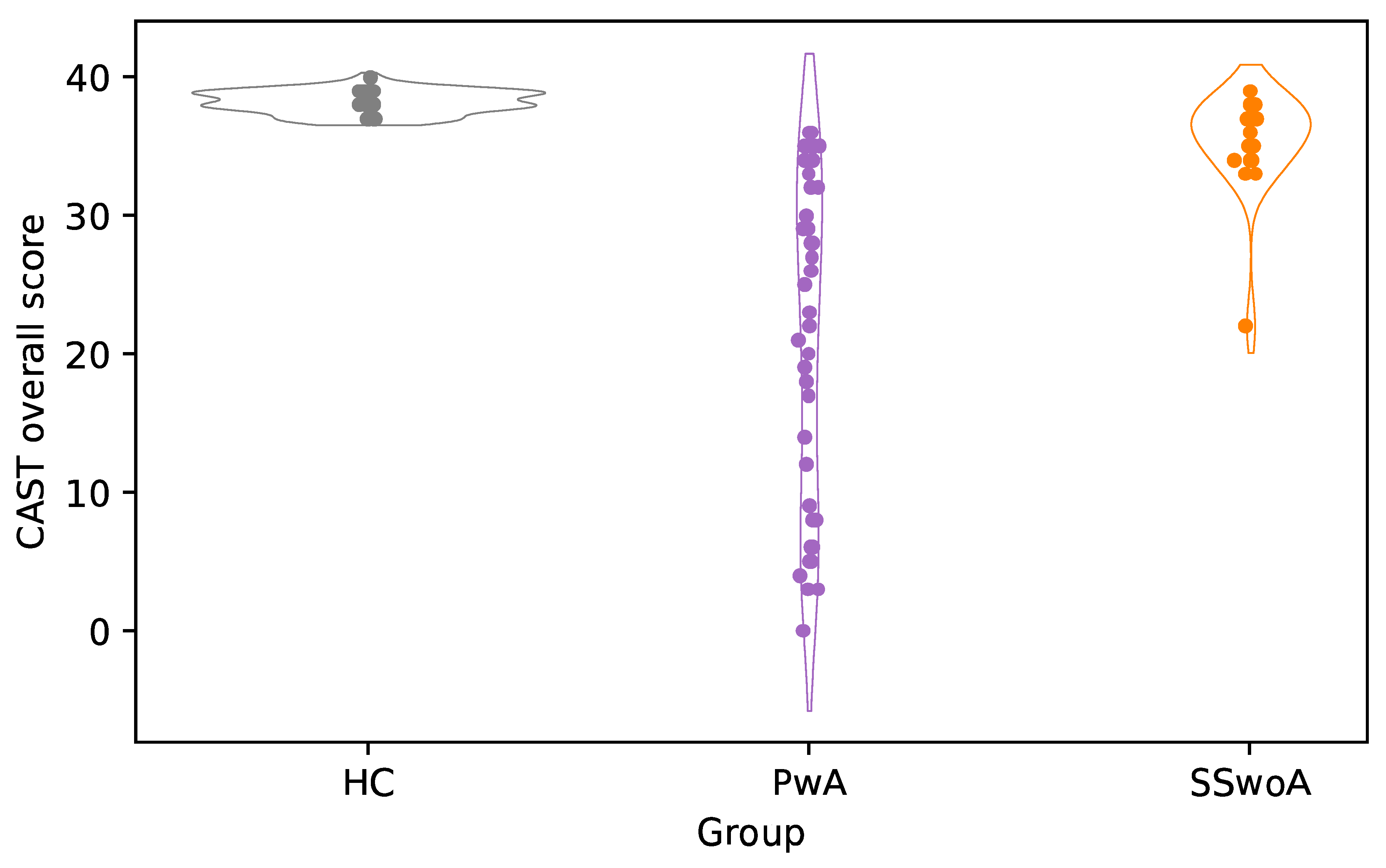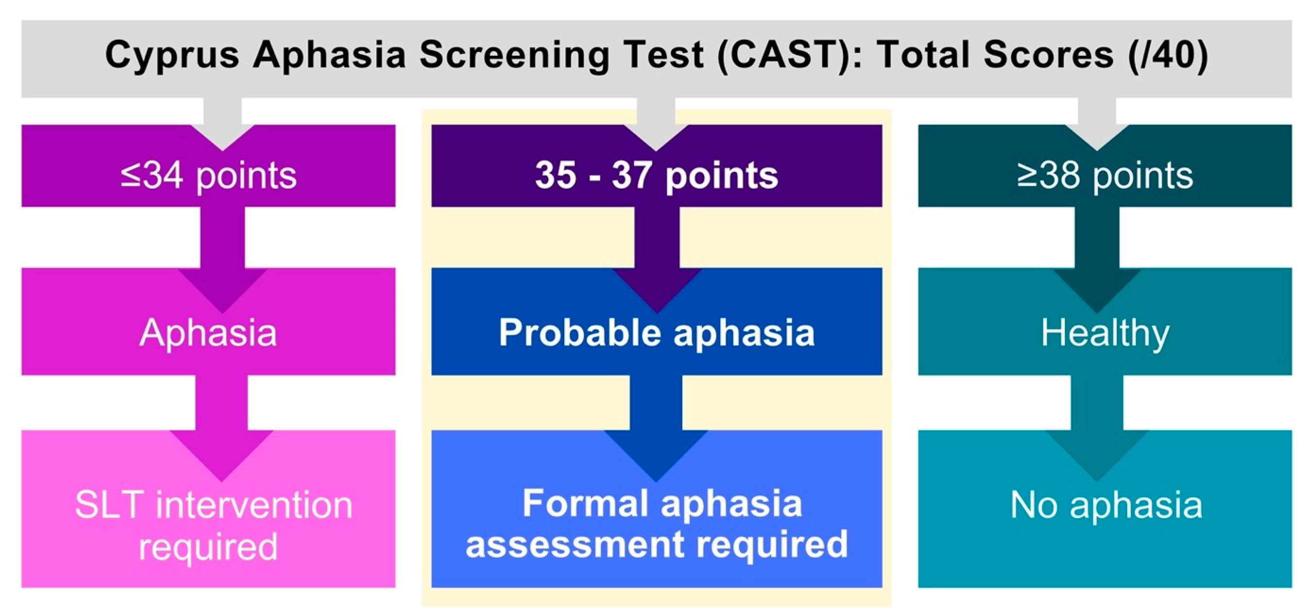 - The CAST is a brief clinician-reported measure. It consists of a short case history interview followed by ten subtests: a spontaneous speech sample to assess aphasia severity, verbal fluency tasks, auditory comprehension tasks, word and sentence repetition tasks, and object and picture naming tasks. The CAST is scored out of 40, with lower scores warranting a formal clinical speech and language therapy assessment. The CAST is completed in approximately 8 min, depending on language skills.