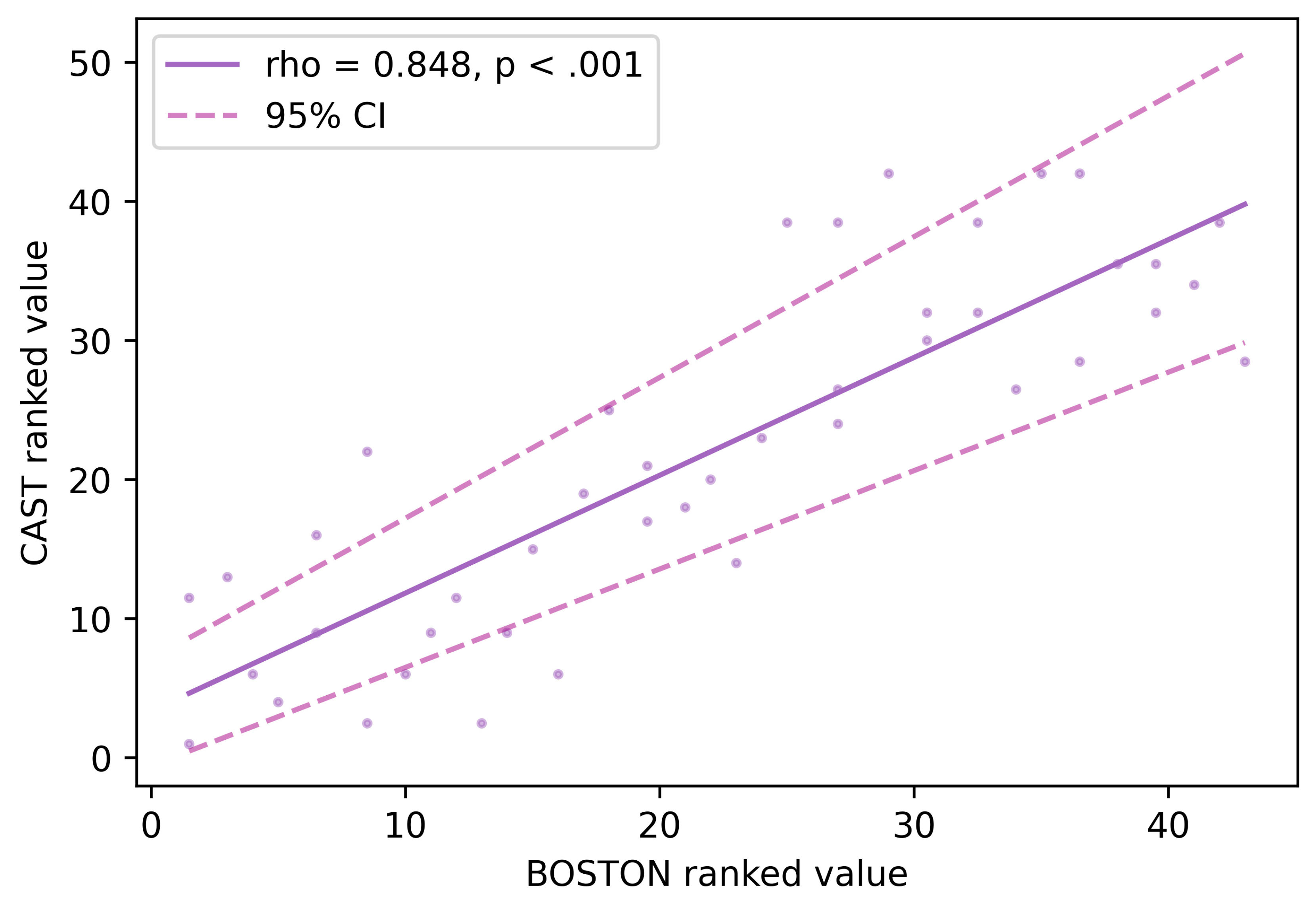 - Test–retest reliability was examined to determine the temporal stability of CAST scores, with intraclass correlation coefficients (ICCs) of 0.75 or higher indicating good reliability [28].