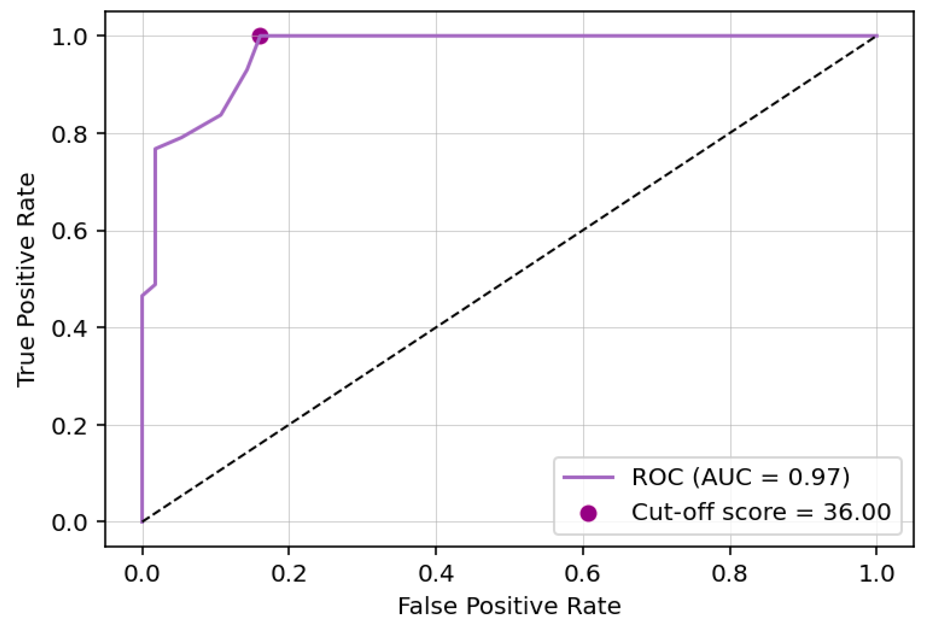 - Diagnostic validity was assessed using the Area Under the Curve (AUC) metric, with AUC values of 0.80 or higher considered clinically useful, values near 1.0 indicating excellent discrimination, and values near 0.50 reflecting chance-level classification [28]. Optimal cut-off scores were determined by identifying the point at which sensitivity and specificity were maximized [31].