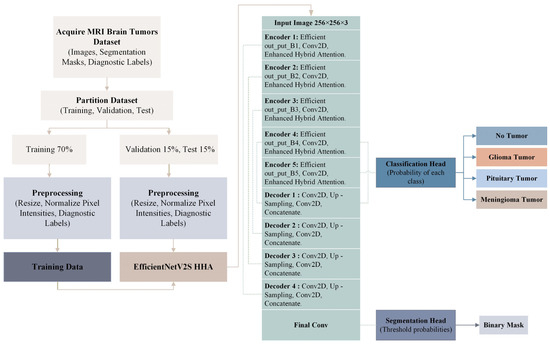 To provide a clear view of the overall design, Figure 1 summarizes the complete workflow of the proposed framework. The pipeline begins with data acquisition and preprocessing, then proceeds to training and inference using an EfficientNetV2S backbone integrated with the Hierarchical Hybrid Attention (HHA) mechanism. The framework performs segmentation and classification in a unified manner, enabling simultaneous tumor delineation and type recognition within a single computational flow.