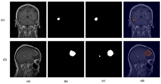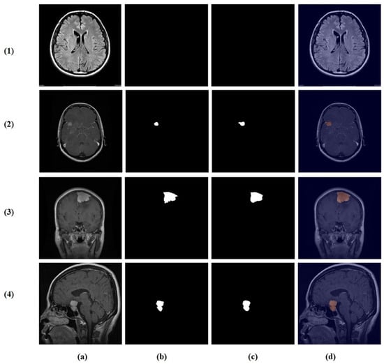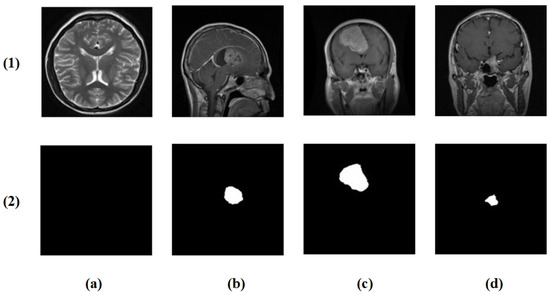 Example cases from the brain tumor segmentation dataset: (1) original MRI slices and (2) corresponding ground truth masks. Columns (a–d) show the following four classes: no tumor, glioma, meningioma, and pituitary tumor.