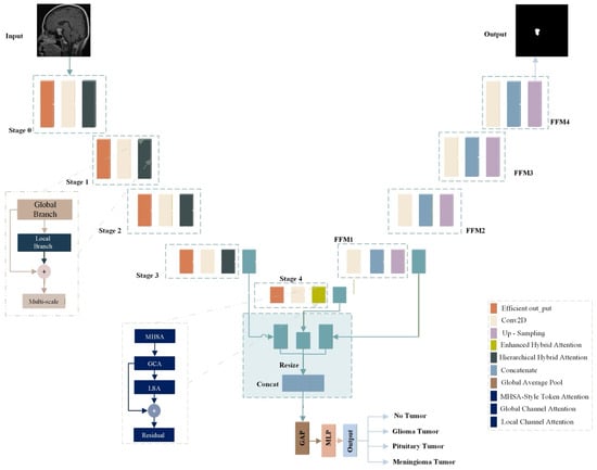 The proposed EfficientNetV2S HHA performs brain tumor segmentation and classification at the same time using a shared encoder with two task specific branches. Figure 4 outlines the design. The segmentation branch follows a U-shaped encoder–decoder layout with hierarchical stages that support multi-scale feature extraction and fusion. The classification branch draws features from several encoder depths to distinguish glioma, meningioma, pituitary tumor, and no tumor.