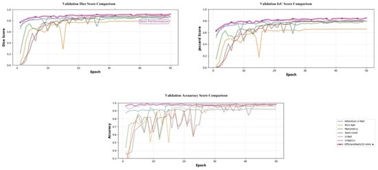 The proposed EfficientnetV2S HHA demonstrated exceptional performance across both segmentation and classification tasks. As summarized in Table 3, the model achieved a Dice coefficient of 92.25% and Jaccard index of 85.77% for segmentation tasks, while attaining an overall classification accuracy of 99.53%. The precision, recall, and F1 score metrics all approached 99%, indicating robust and balanced performance across both tasks. The training accuracy curve demonstrates rapid convergence and stable performance throughout the training process, with the model achieving over 99% accuracy on the validation set and maintaining consistent performance through the remaining epochs.