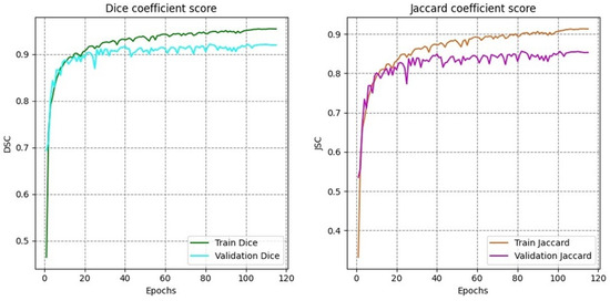 Training and validation curves for Dice coefficient and Jaccard index across epochs.