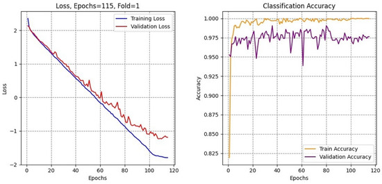 To determine the optimal data partitioning strategy, four different train-validation-test splits were evaluated, as shown in Table 5. The 70-10-20 split configuration yielded the best overall performance, with a Dice coefficient of 92.25% and classification accuracy of 99.53%. This split provided sufficient training data (70%) while maintaining adequate validation (10%) and testing (20%) sets for robust evaluation. The 80-10-10 split showed competitive segmentation performance (91.99% Dice) but slightly lower classification accuracy (98.82%), suggesting potential overfitting with larger training proportions. The 60-20-20 split demonstrated the lowest performance across all metrics, indicating that reducing training data below 70% adversely affects model learning capability.