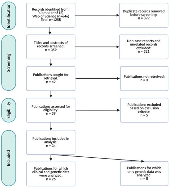 PRISMA flow diagram illustrating the record screening and study selection process. A total of 34 publications representing 105 individuals were included for this systematic review. Among these, 26 publications reporting on 66 individuals were analyzed to update the clinical characterization of HVDAS. Eight publications encompassing 39 cases did not contain sufficient clinical information, and for this reason only genetic information was extracted.