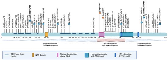 A more robust genotype-phenotype relationship emerged following the discovery of dual methylation patterns, or episignatures, in peripheral blood from affected individuals [51,52]. Specifically, an episignature depends on the position of the variant within the ADNP gene: variants in the N- or C-terminal regions of the protein induce genome-wide CpG hypomethylation (class 1), whereas those within or adjacent to the NLS sequence and the proximal part of the homeobox domain result in CpG hypermethylation (class 2). These opposing episignature correlated modestly with the clinical presentation of affected individuals, reinforcing initial findings that the p.Tyr719* carriers exhibited more pronounced motor delay. Class 2 individuals additionally showed higher prevalence and severity of autism spectrum disorder [51,52]. Episignature testing may serve as a complementary diagnostic tool, alongside exome and genome sequencing, but its use is largely confined to research settings. It may aid, e.g., in reclassification of VUS when a matching episignature is identified. A negative episignature, however, does not exclude pathogenicity of a specific variant.