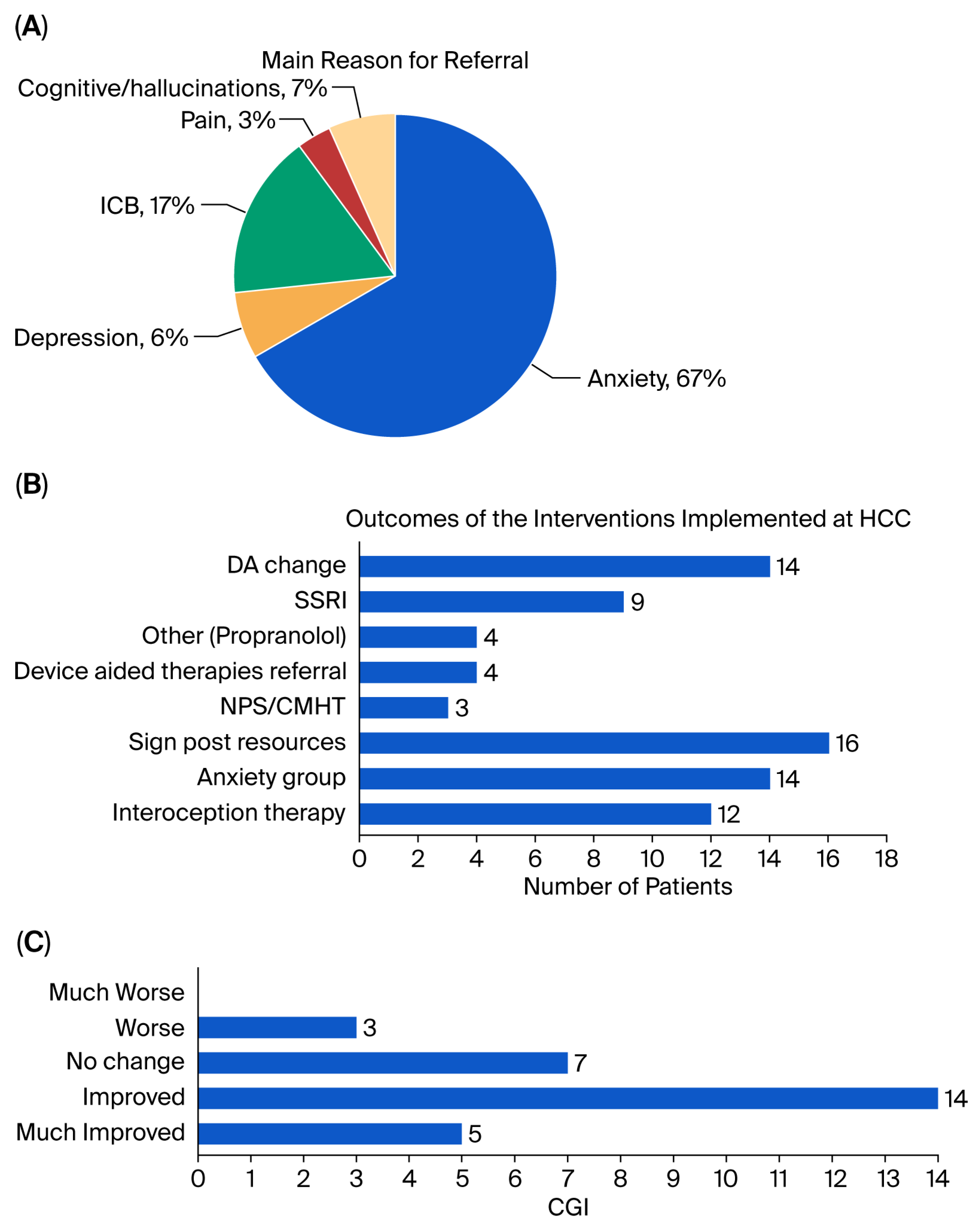 Figure 1A. Anxiety was the most common reason for referrals (67%), followed by impulsive compulsive behaviour disorders (ICB). Referrals originated from neurologists (N = 14), PD nurses (N = 14) and general practitioners (N = 2).