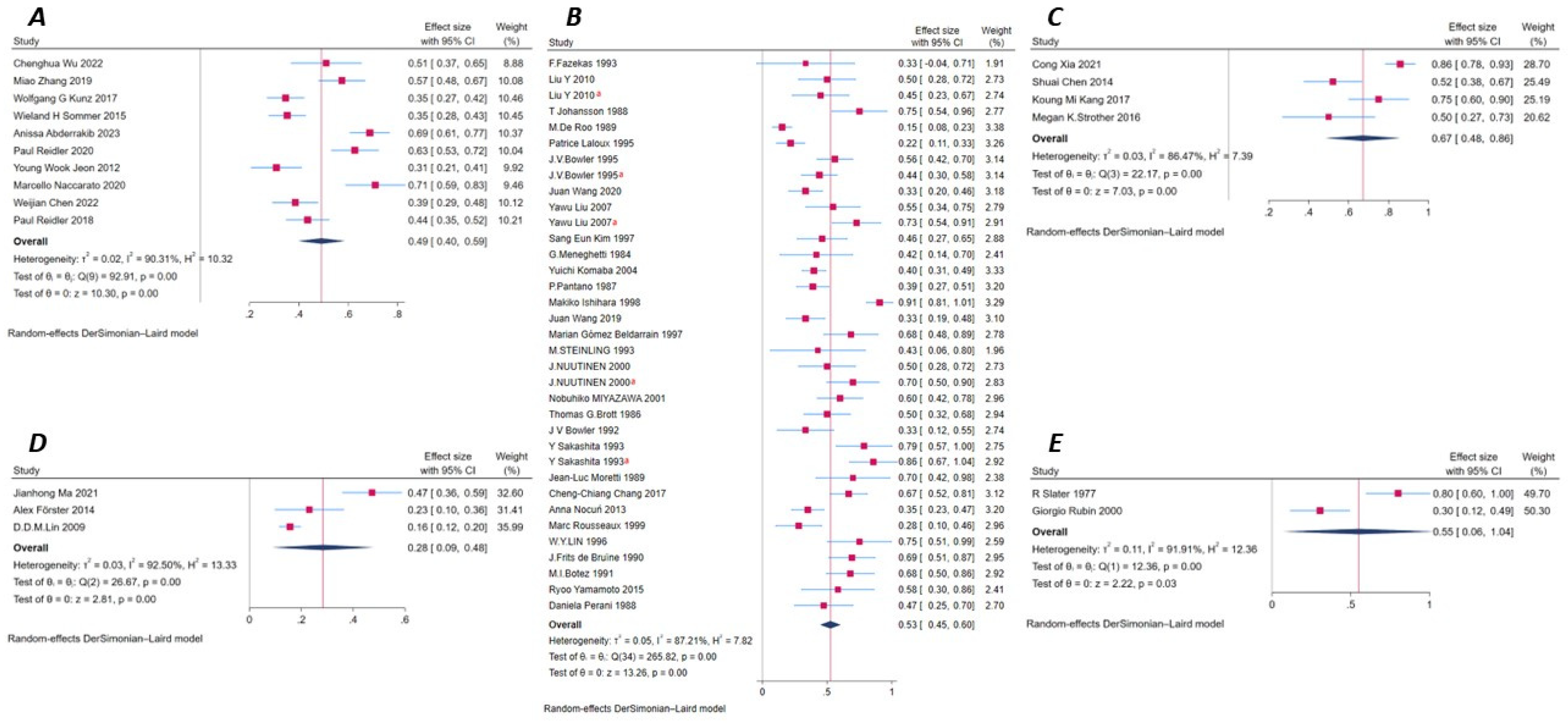 | SPECT | 0.51 | 0.42, 0.59 | 432 | 959 | 87.64% | <0.001 |
