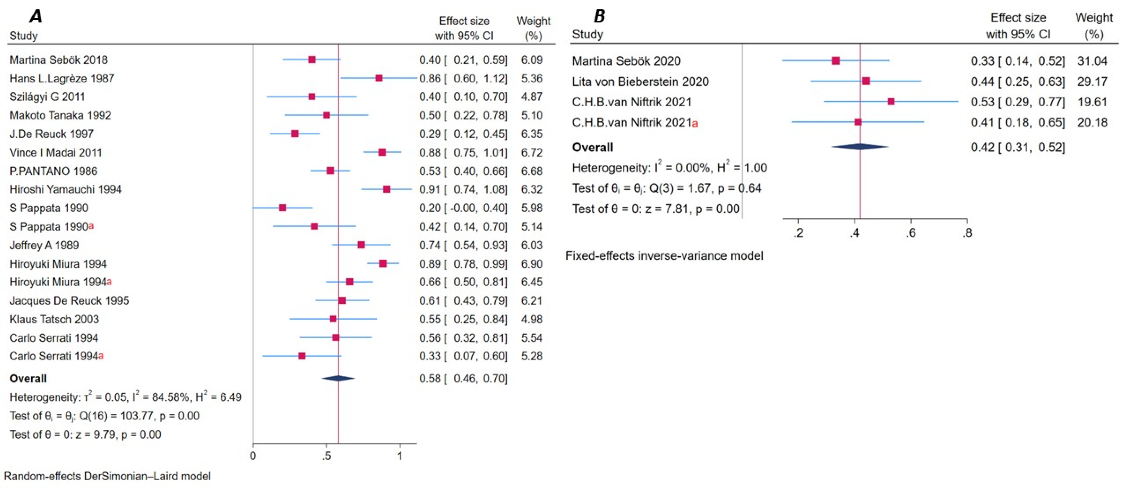 | Age < 63 y | 0.56 | 0.47, 0.64 | 517 | 928 | 87.83% | <0.001 |