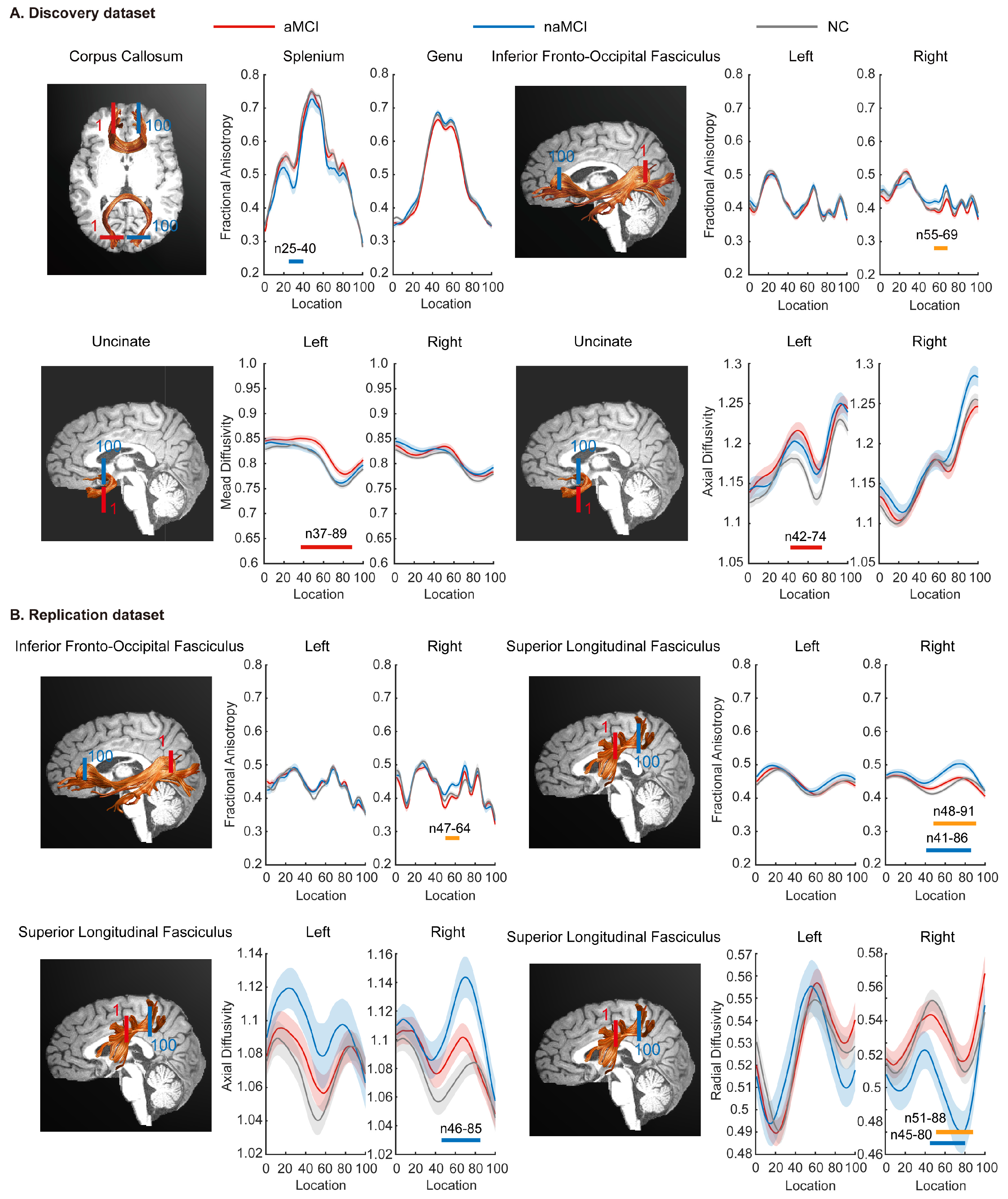 3.2. Differences in White Matter Tract Profiles Among aMCI, naMCI, and NC Groups