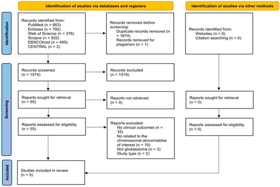 A systematic literature search was conducted across databases and search engines (PubMed, Embase, CENTRAL, Scopus, EBSCOhost, and Web of Science) up to 20 April 2025. Keywords using MeSH and DeCS descriptors, as well as free terms, were applied to search for “whole chromosome 7 gain”, “whole chromosome 10 loss”, “chromosome 7 gain/10 loss”, and “glioblastoma”.