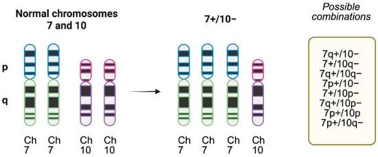 Chromosome 7 gain and chromosome 10 loss patterns of alterations. Complete chromosome 7 gain (trisomy) and 10 loss (monosomy) is the most frequent pattern, but several possible combinations in the short (p) or long arm (q) exist and have been described in molecular studies. Created with www.biorender.com.