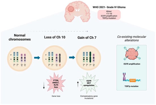 Progression from normal chromosomal configuration to the characteristic gain of chromosome 7 and loss of chromosome 10 (+7/−10) is observed in GBM. The loss of chromosome 10 leads to the deletion of key tumor suppressor genes, including PTEN, ANXA7, and KLF6. There is impaired tumor suppressive functions, and as a compensatory response, there is a gain of chromosome 7, which results in overexpression of oncogenes like EGFR and MET, which promote cell proliferation and survival. These early and co-occurring chromosomal events contribute to genomic instability and establish a clonally advantageous profile that underlies GBM initiation and progression. EGFR amplification and TERT promoter (TERTp) mutations frequently co-occur with the +7/−10 signature, defining a distinct subgroup of high-risk gliomas. This cytogenetic pattern is integrated into the 2021 WHO classification of CNS tumors [30] for the diagnosis of grade IV IDH-wildtype glioblastoma, even in tumors lacking overt high-grade histological features.