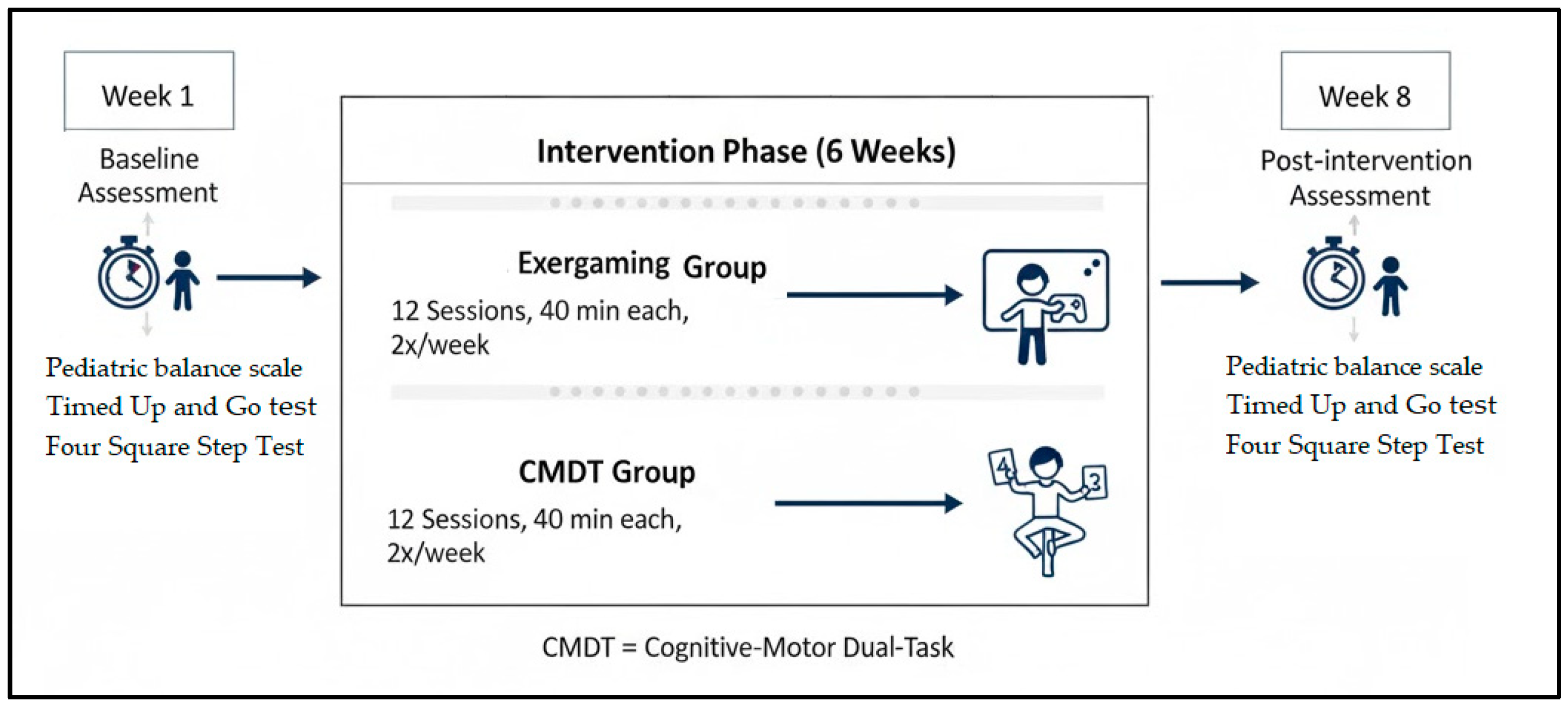 Because both exergaming and CMDT interventions utilize dual-task principles by integrating cognitive processing with physical movement, we hypothesized that both protocols would yield comparable improvements in balance and functional mobility.