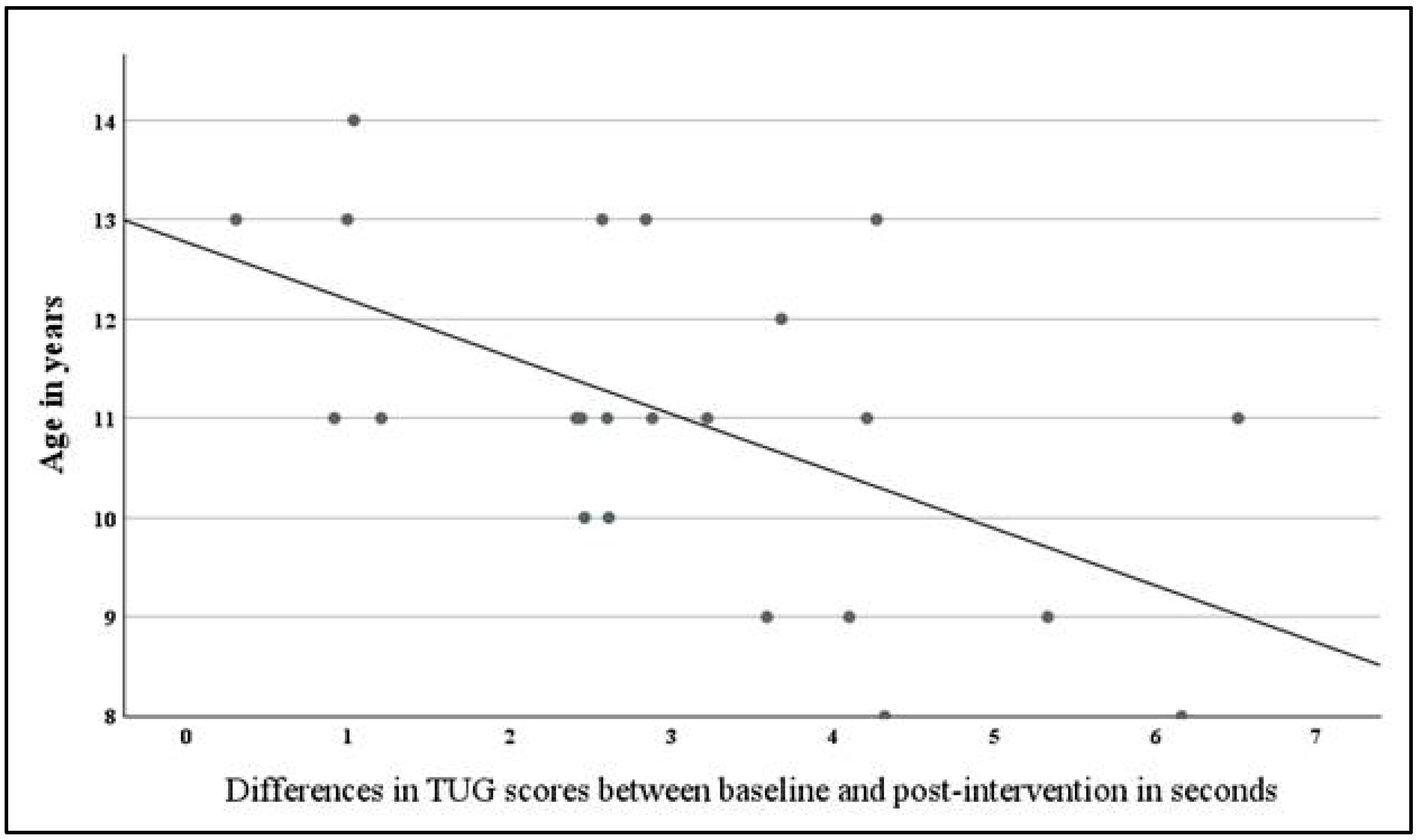 Figure 3 indicates that the reduction in TUG score differences between the baseline and post-intervention (reflecting improved functional mobility) were more pronounced in younger children.
