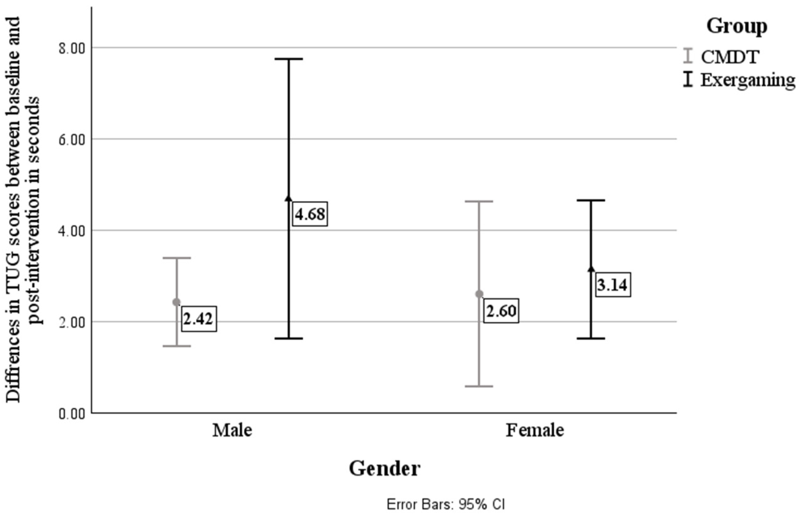 A significant interaction between group and gender on TUG scores was observed in the current study, suggesting that responses to the interventions varied by gender. Male participants in the exergaming group showed significantly greater improvements compared to males in the CMDT group. However, the reasons for this superior performance remain unclear as participant preferences were not recorded.