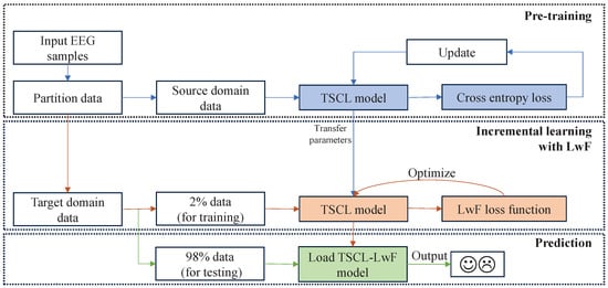 To assess the performance of the proposed TSCL-LwF model on two datasets, a leave-one-out cross-validation method was employed [34,35]. Specifically, in each experiment, given M subjects in the dataset, the EEG data of subjects was selected as the source domain data, while the one remaining subject provided the target domain data. Moreover, 2% of the target domain data was allocated as an incremental dataset, which was randomly selected with a fixed random seed (42) to ensure reproducibility, and the remaining 98% of the target domain data was utilized as testing data. Each experiment was repeated 5 times, and the mean performance (±standard deviation, STD) is reported.