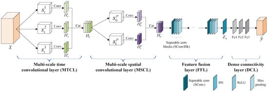 The FFL is used to integrate the extracted spatio-temporal interaction features. It consists of a stack of separable convolutional blocks (SConvBlk), each containing four layers: a separable convolutional layer (SConv), a BN layer, a layer, and a max pooling layer. Each SConv includes a depthwise convolution and a pointwise convolution. The depthwise convolution uses a convolution kernel of size to perform convolution along the spatial dimensions on the input features, with the number of kernel channels matching that of the input features. The pointwise convolution employs a convolution kernel to linearly merge the outputs from the depthwise convolution operation, thereby fusing inter-channel information. The computation of the first SConvBlk can be simplified by the equation , where represents the output of the MSCL, represents a separable convolution operation, represents the composite operation incorporating layer, layer, and max pooling layer (applied sequentially after each SConv), and represents the reshape operation. The SConvBlk is computed similarly to the first one by Equation (5):