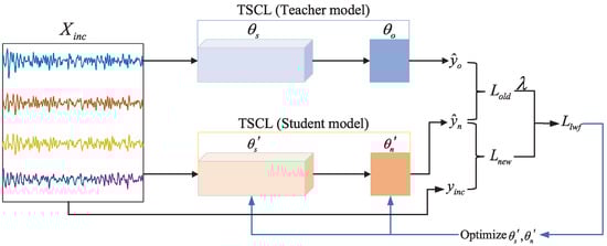 Due to the limited annotated data of new subjects, conventional fine-tuning of pre-trained models can easily lead to overfitting to noisy features or personalized irrelevant features of new subjects. In this work, a limited set of labeled target domain data () is utilized as the incremental dataset, and the pre-trained TSCL model is fine-tuned using LwF. This enables the model to rapidly adapt to the target domain data and further align the data distributions between the source and target domains, thereby improving recognition accuracy. The training process of LwF is illustrated in Figure 4. First, the samples are fed into both the student and teacher models. Subsequently, the LwF loss is computed based on the output discrepancy between these two models, and this loss is then used to optimize the parameters of the student model. In this process, the pre-trained TSCL model serves as the teacher model, and the student model inherits the teacher model’s parameters and simultaneously initializes the DCL parameters . Notably, the teacher model does not participate in backpropagation during this process.