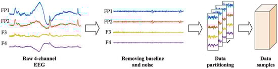The schematic diagram of the preprocessing steps for EEG signals is shown in Figure 5. Firstly, the 3 s baseline signals were eliminated from each trial. Then, the data was downsampled to 128 Hz, and a 4–45 Hz bandpass filter was applied to remove noise. The filtered data were subsequently re-referenced. Finally, electrooculography (EOG) was eliminated, employing the method outlined in the literature [29]. These preprocessing steps were provided as part of the official DEAP dataset, and the preprocessed EEG signals were directly used in our experiments. To address the requirement for a sparse-channel EEG in natural environment applications, based on the left–right brain asymmetry theory, we selected four EEG channels (i.e., FP1, FP2, F3, F4) from the prefrontal region [31]. Meanwhile, in order to solve the problem of the limited number of samples, we adopted a non-overlapping sliding window of 1 s for data segmentation. Additionally, the EEG signals of each channel were normalized to the range of [0, 1]. After preprocessing, there were 40 × 60 = 2400 data samples per subject (40 trials, each containing 60 1 s signals), totaling 76,800 data samples. Each data sample had a size of 4 × 128 (number of channels of 4 and temporal length of 128). According to previous work [32], in the valence and arousal classification, labels below 5 were classified as low categories, while labels above 5 were classified as high categories. In the valence–arousal classification, labels were classified into four categories: LVLA (valence < 5, arousal < 5), LVHA (valence < 5, arousal ≥ 5), HVLA (valence ≥ 5, arousal < 5), and HVHA (valence ≥ 5, arousal ≥ 5).