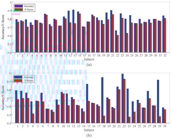 Experimental results of TSCL-LwF for each subject in arousal classification on different datasets. (a) DEAP dataset. (b) EPPVR dataset.