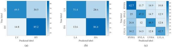 Confusion matrix of TSCL-LwF for emotion classification on the DEAP dataset. (a) Valence. (b) Arousal. (c) Valence–Arousal.