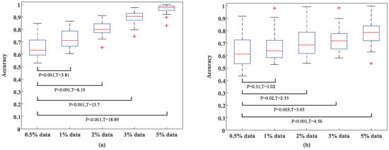 To validate the classification performance of TSCL-LwF with different incremental training data sizes, we designed a progressive experiment. The incremental dataset size was set to 0.5%, 1%, 2%, 3%, and 5% of the target domain data. The 0.5% incremental dataset was selected as the baseline as it represents the most data-constrained scenario. Moreover, this setup allows for a more distinct demonstration of the positive impact of data volume expansion on model performance. Figure 10 shows the experimental results of arousal classification trained using different amounts of target domain data. As presented in Figure 10a, on the DEAP dataset, when only 1% of target domain data is used, accuracy exceeds 70%, demonstrating strong adaptation to small samples. When the model is exposed to 3% of target domain data, accuracy surpasses 88.4%, and with 5% of target domain data, it exceeds 96.8%. These results indicate that as the sample size increases, the model effectively learns general features of sparse-channel EEG signals, thus enabling efficient emotion classification. Furthermore, statistical tests with a significance level of 0.001 confirm that the accuracy improvement with small amounts of incremental data is not attributable to random fluctuations or extreme values. Figure 10b illustrates that the classification accuracy of the model on the EPPVR dataset also improves with an increase in target domain training samples. However, the accuracy improvement on DEAP is more significant than that on EPPVR as incremental training samples increase. This could be due to the DEAP dataset having a larger incremental dataset than EPPVR, which helps the model learn more EEG characteristics from new subjects, leading to better recognition accuracy.