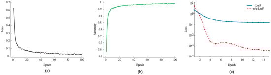(a) The loss curve of the pre-training phase. (b) The accuracy curve of the pre-training phase. (c) The loss curve of the incremental learning phase.