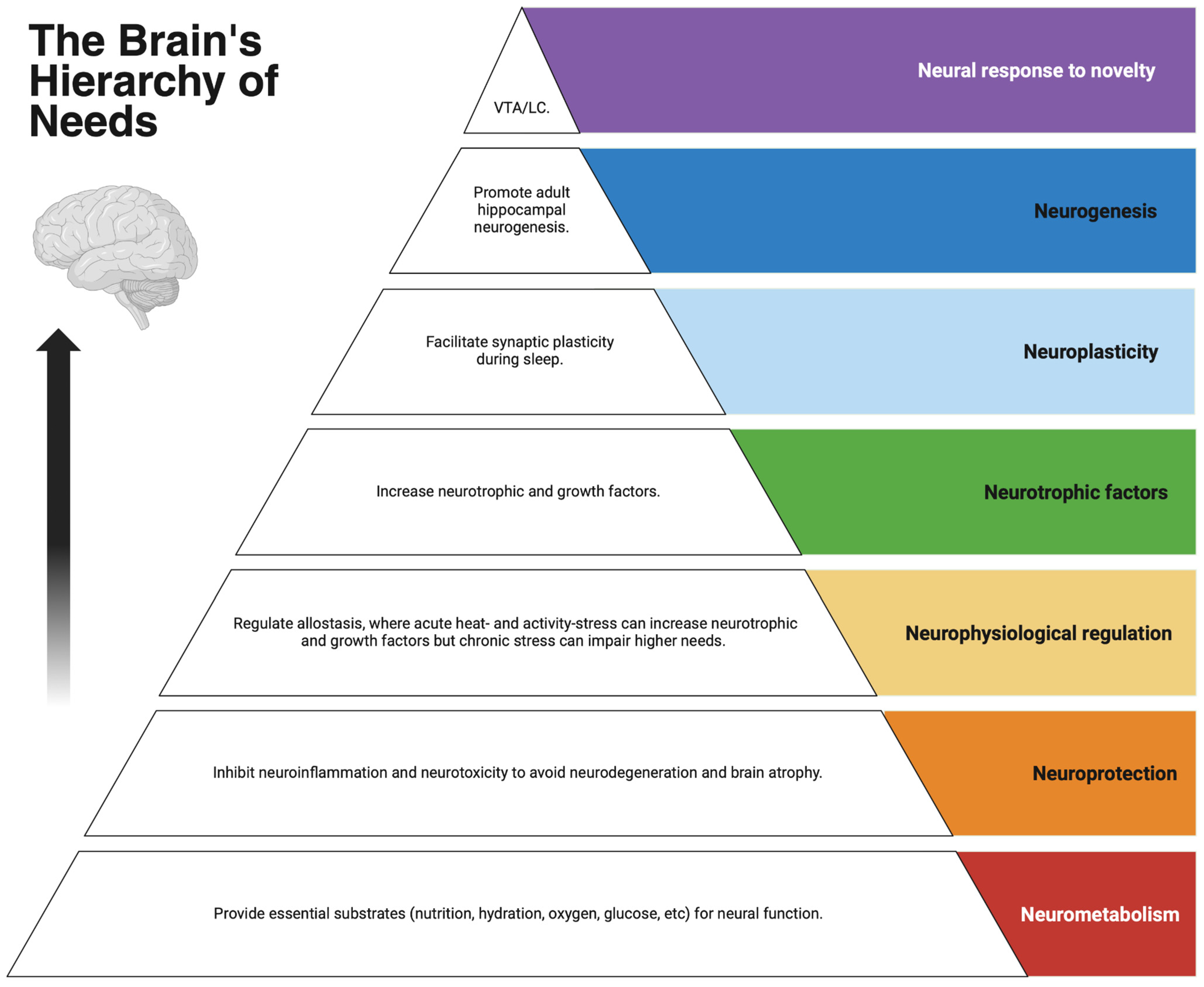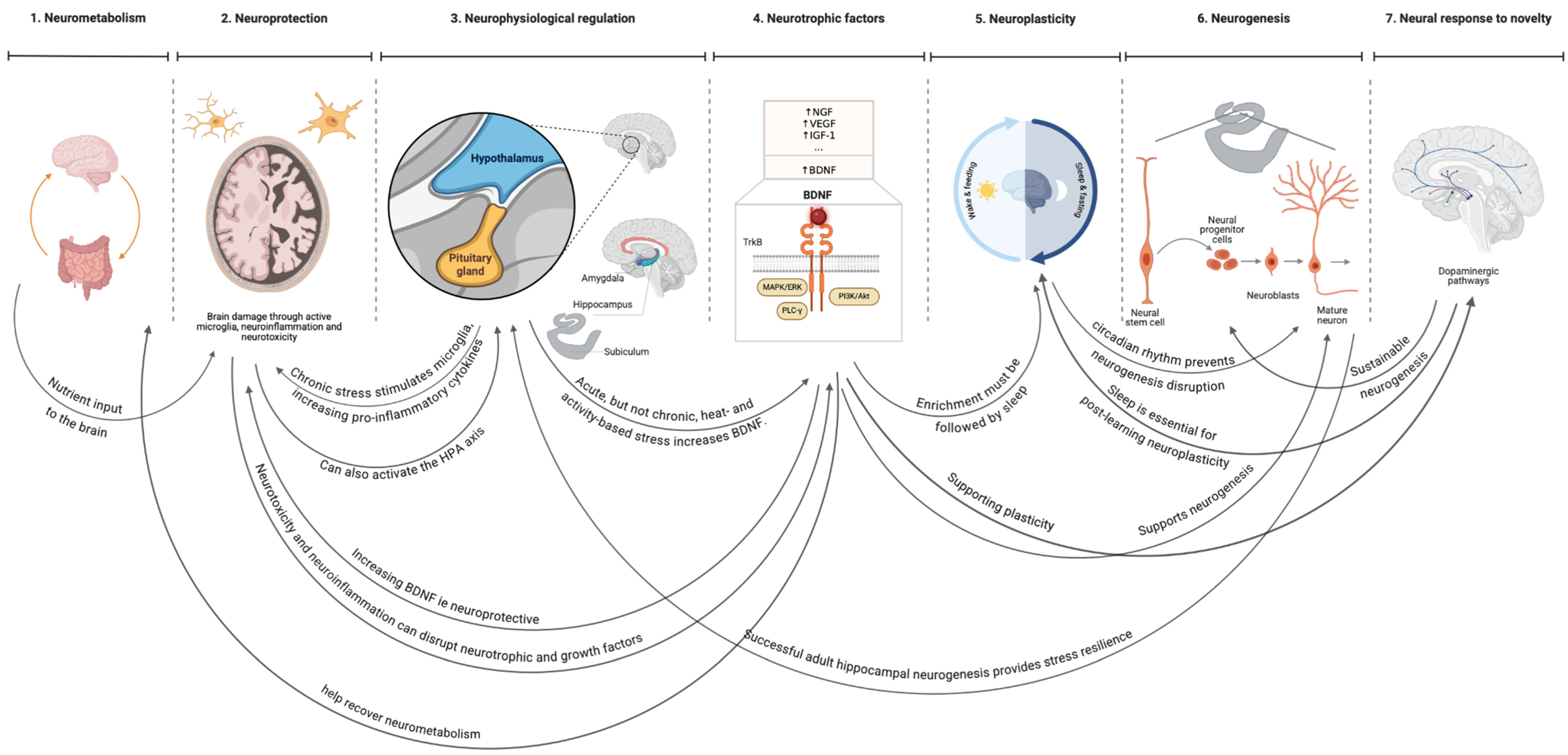 | Neurotrophic factors | Brief exposure to heat stress > 26 °C | Bright light > 10,000 lux, and dark/light cycles | Affordances for activity > 3.5 metabolic equivalents |