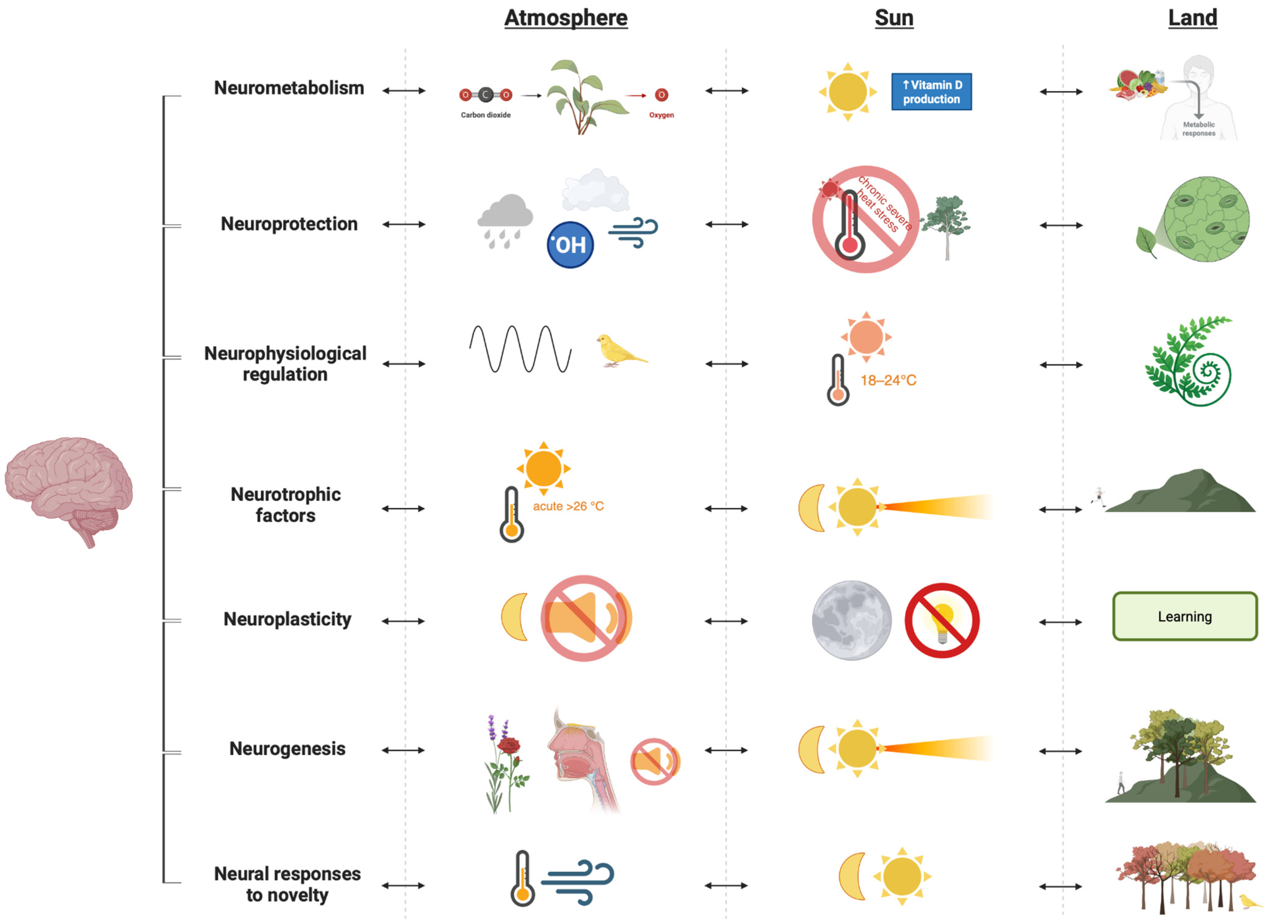 | Neurometabolism | Provision of oxygen for neural function | Sunlight enabling vitamin D synthesis for brain function | Nutrients water and diverse food sources |