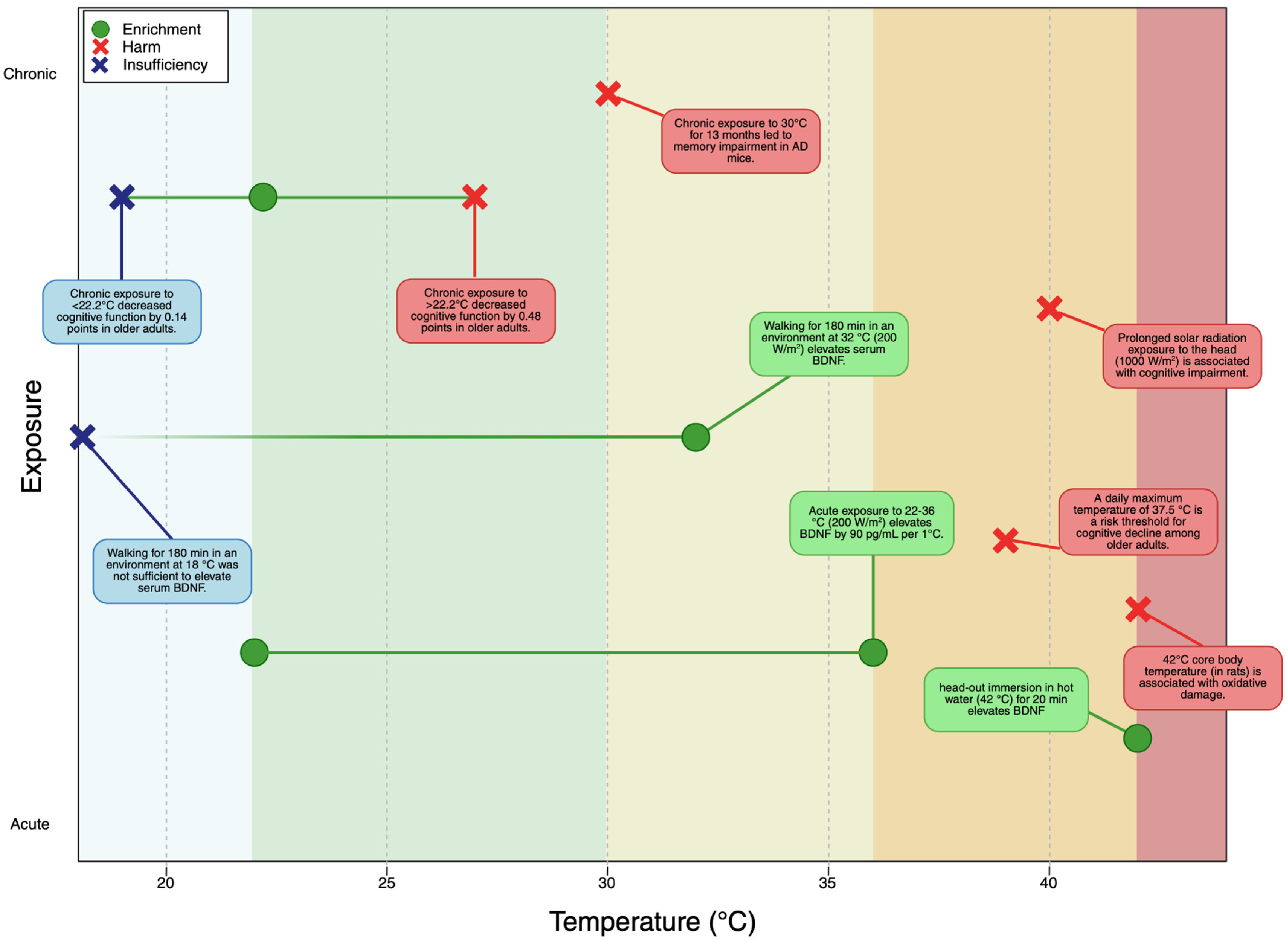 | Ambient heat (healthy adults) | 22–36 °C | Acute (unspecified) | ↑ BDNF 90 pg/mL per 1 °C [41] |