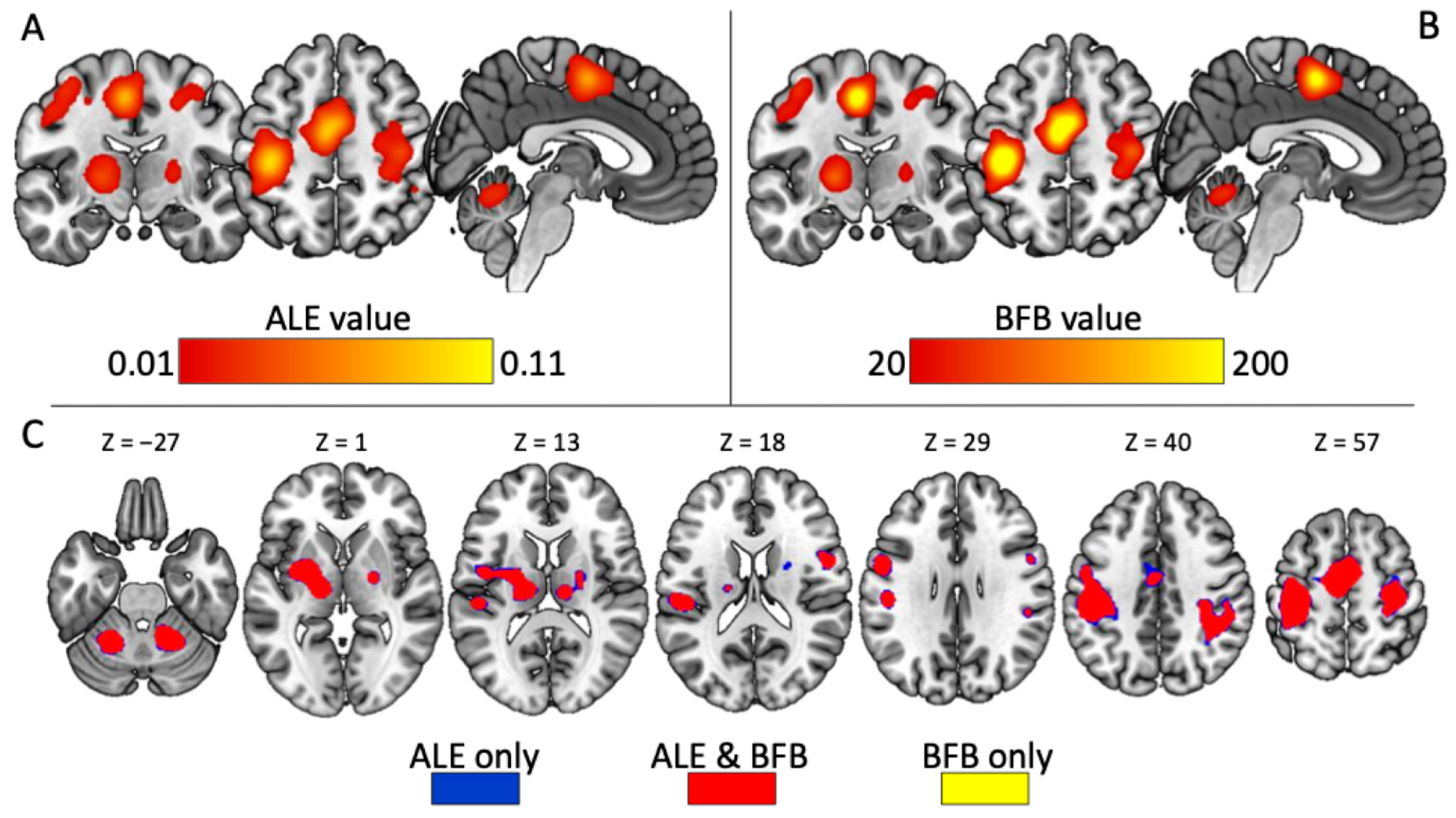 Figure 1C provides an overlay comparison of the two approaches. Although the spatial patterns identified by the two methods overlap substantially, the BFB map reveals pronounced variability in evidential strength among voxels that are all deemed “significant” under the classical ALE framework. In other words, voxels sharing the same thresholded