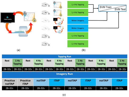 The tapping task was used to establish the classifier model (2-class: tap vs. rest) for the motor imagery neurofeedback. Each run contained six blocks of tapping (either 1 Hz or 4 Hz) that alternated with six blocks of rest (Figure 1c). The duration of each block was 28–32 s. All subjects received the same order as shown in Figure 1c. Participants used an MR-compatible button box (MRA, Inc., Washington, PA, USA) and were instructed to use their right index finger to tap in time with a flashing blue cross on a screen in front of them (following procedures in [55]). The task was explained to participants during a simplified pre-MRI practice session, which familiarized participants with the button box and the gray feedback bar used in the tapping blocks. As in our prior studies [55,56], a gray feedback bar indicated the most recent tap-to-tap rate based on its right–left location and, thus, whether the last press was slower than, in time with, or faster than the flashing speed. For rest blocks, participants viewed a blue non-flashing cross on a black background (See Video S1).