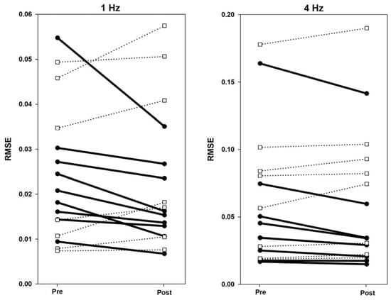 Individual Δ RMSE values from pre- to post-imagery for 1 Hz and 4 Hz. Bold lines indicate task improvement by lowering RMSE post-imagery. Dotted lines indicate no task improvement post-imagery.