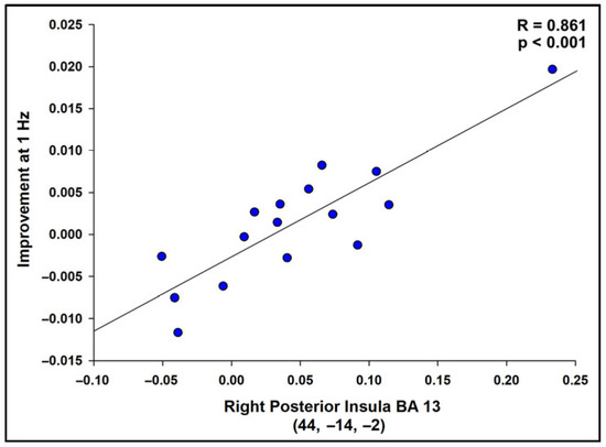 Scatterplot displaying the correlation between successful imagery BOLD activation and improvement in the tapping task at 1 Hz (RMSE) for the region with the highest t-value, R = 0.861, p < 0.001. Scatterplots were similarly strong for all regions in Table 3, indicating that the results were not driven by a small number of participants. See Table S3 for correlation values.